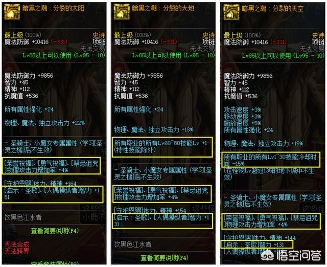 分裂的太阳:勇气祝福物理攻击力增加率加4%,启示:圣歌智力增加151点;分裂的大地:勇气祝福物理攻击力增加率加4%,启示:圣歌智力加131点,60级到80级的技能等级加1级;分裂的天空:勇气祝福物理攻击力增加率加4%,启示:圣歌智力加131点,1-30级的技能CD减少15%。