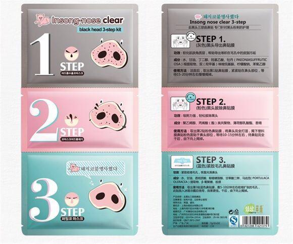 猪鼻贴去黑头分为三贴,第一贴(灰色)黑头导出鼻贴膜,第二贴(粉色)黑头拔出鼻贴膜,第三贴(蓝色)紧致毛孔鼻贴膜。第一贴帮助软化肌肤角质层,帮助导出堆积在毛孔中的皮脂污垢。第二贴吸附力强,可轻松拔出黑头。第三贴共有三层,去除夹在中间的一层,可以紧致收缩毛孔,回复光滑肌肤。