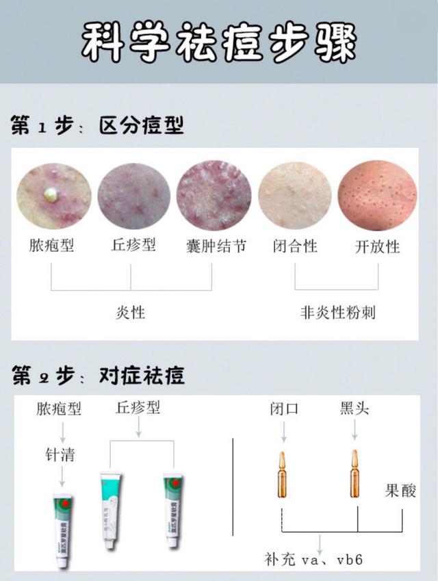 首先第一步,我们要知道痘痘类型分为炎性痘痘和非炎性痘痘。非炎性痘痘就是闭口和黑头,成片的闭口和黑头大多由于皮肤出油过多导致的,这个可以口服VB、VA,因为补充VAVB可以起到控油的效果,还可以减轻痘痘的炎症程度,这个我一直都在坚持每天口服VAVB,也可能是其他因素总之确实不会莫名其妙就长痘了;然后我们要适当注意清洁皮肤,但是清洁过度有可能会皮肤屏障受损,这样细菌在脸上繁殖也会长痘的。重点我们来讲讲炎性痘痘,炎性痘痘可以分为丘疹性(红红的无脓包)、脓包性(有脓包)、囊肿性(摁下去硬硬的有时还疼)。丘疹性痘痘用红霉素软膏就行了,我一般用两三个晚上就消下去了,有时我不管它它自己也能消;脓包型痘痘:用阿达帕林,但注意这个得避光,意味着只能晚上睡觉之前涂,哈哈我一般等它成熟了就会忍不住挤掉,大家千万别学我,满脸痘印(捂脸);囊肿性痘痘,这个就比较严重了,一般就是真皮感染了,用百多邦莫匹罗星,嗯这个真的有效果但是得有耐心,毕竟这么严重的痘痘修复也要一段时间嘛,我坚持涂一个星期就不疼了也渐渐就好了~去痘印:用积雪苷霜软膏,修复痘印是个漫长的过程,要有耐心坚持涂下去!
