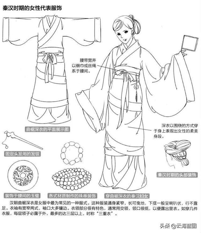 汉朝曲裾深衣是女服中最为常见的一种服饰。这种服装通身紧窄,长可曳地,下摆一般呈喇叭状,行不露足。衣袖有宽窄两式,袖口大多镶边。衣领部分都很有特色,通常用交领,领口很低,以便露出里衣。如穿几件衣服,每层领子必露于外,最多的达三层以上,时称“三重衣”