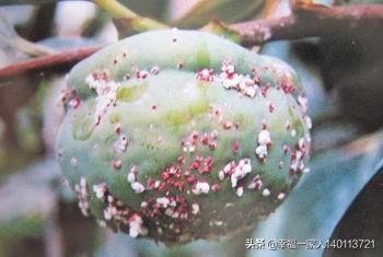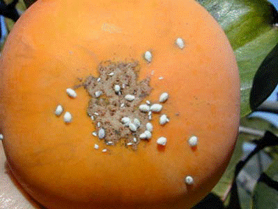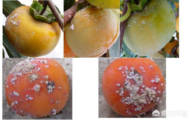 柿子果上:在我们的柿子树上常会发现,柿子表皮布满白色堆积物,如果除掉后会留下伤疤,严重的引起果皮腐烂,而我们用手挤压时,会有红色液体流出。
