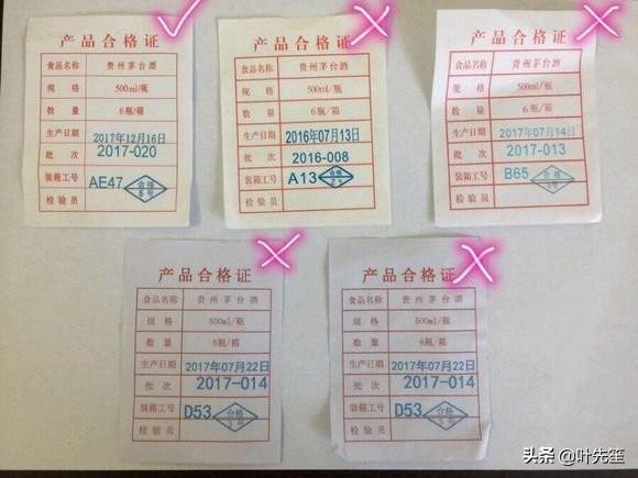 每一箱的里都会有一张产品合格证,不知道大家是否留意过这个呢? 今天就教大家用产品合格证的装箱工号辨别真假:2017年7月7日之前的都是一个字母开头的,2017年7月7日之后的都是两个字母开头。比如:下图第二张装箱工号A13对应合格号为1号,A代表1,而它是对应2号,那就是不对应编号,那就是假酒。第三四五的是2017年7月7日后生产,是要两个字母的,它们为一个,所以是假酒。第一张是真的,因为AE47,相对应的数字的字母则是第二个字母,E表示5,其对应合格5号,那就是真的。