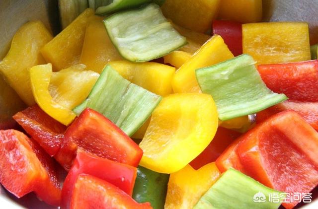 3、彩椒也切成跟猪肉块差不多大小的方形块。