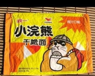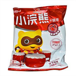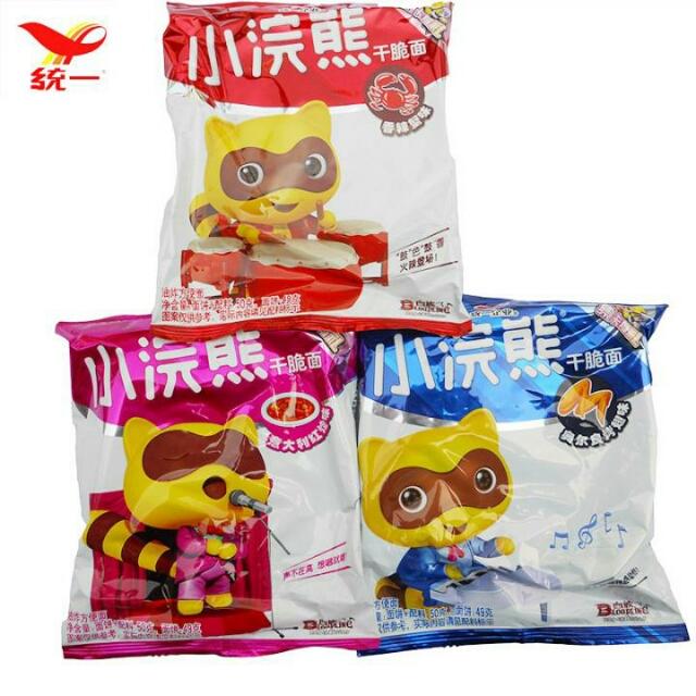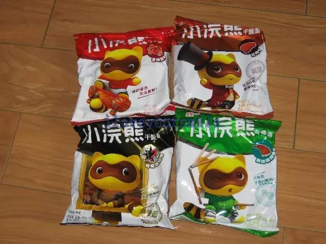 小碗熊干脆面,不同包装的口味就不一样。小时候最喜欢吃的,就是大红色包装的。