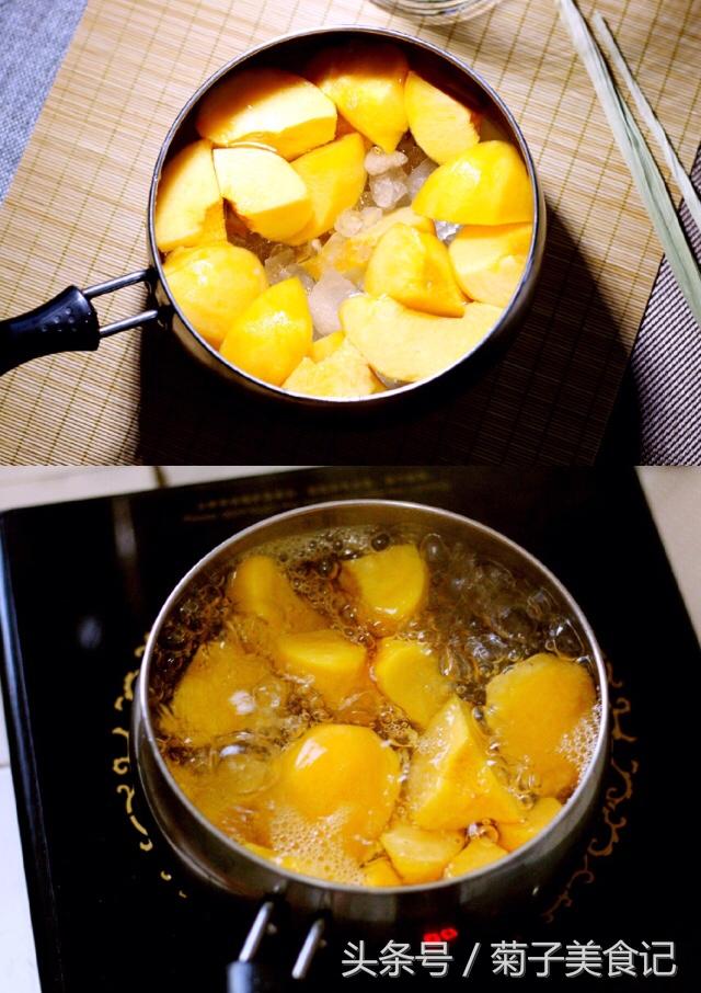 切好的黄桃放入锅中,放入凉水,水刚好沒过黄桃即可,放入冰糖,大火煮开,撇去浮沫,约15分钟,煮至黄桃变软,飘着黄桃的香味即可