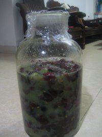 3.放入葡萄和糖后,放入7分满就可以了,防止益出,盖好,放在阴凉处一个月左右就可以喝了,可以直接降酒到出,放葡萄二次发酒,这样泡出来的葡萄酒度数比较高,但是很香味道好甜。