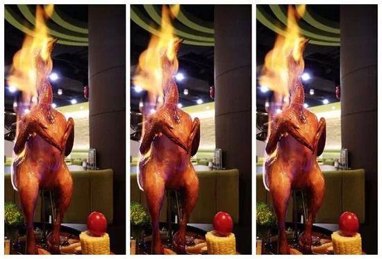 “侏罗纪鸡”一上桌,视觉非常震撼,雄赳赳站立的造型,浇上酒点着火,霸气十足,的确有点恐龙的影子。据说,这道菜是大厨十年前研制出来的,灵感正是从电影《侏罗纪公园》获取。为保证入味,鸡要放进秘制卤水里腌制18个小时,然后把腌好的鸡放入烤炉里吊烤风干12个小时,层层工序才能达到皮脆肉嫩、鲜香无比的口感。最后上桌时,点火助燃,让食客们在吃之前先享受一顿视觉盛宴。