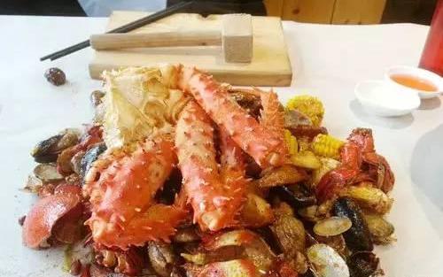 木槌加砧板,吃的就是这一大盆的海鲜。上菜的规矩是把刚出炉的海鲜一股脑地倒在桌子上,称为台宴,然后大家直接上手,用木槌征服蟹腿,用筷子搞定贝壳,敲敲打打乐在其中。