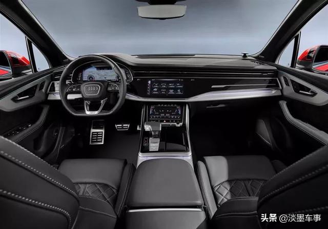 内饰的造型可以说是翻天覆地一样的变化了,我之所以说奥迪Q7这次的改款堪比换代,就是因为这个内饰,现款奥迪Q7的内饰虽然精致,但还是简单了一些,缺少了一些豪华感,而新款Q7的内饰沿用了奥迪全新的家族化内饰设计,三块屏幕组成的内饰看上去非常有科技感,金属的运用也恰到好处,可以说在内饰的科技感和氛围上,这次奥迪Q7可是完全不落后了。