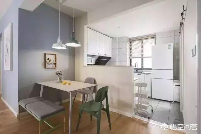 ▲将餐厅置于厨房旁边,仅半墙之隔,做开放式设计。天空蓝墙壁+木地板+宜家餐桌椅+吊灯,营造出清新自然的就餐环境。