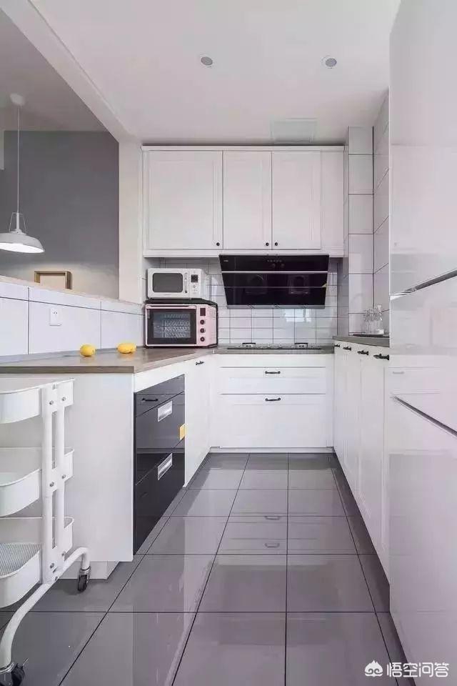 ▲狭长型的厨房,整体以白色系为主,U字型的橱柜布局,既留出了充足的操作空间,海大大增加了收纳功能。