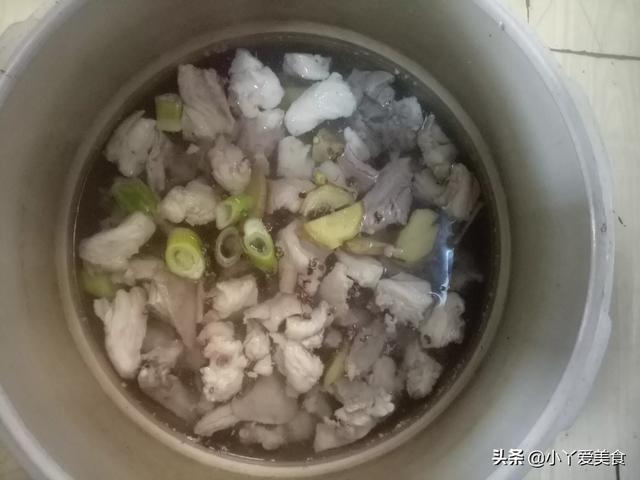 用中火煮开后要反复撇去浮沫,浮沫越少越好,直到汤清为止,这样汤清味美。到入料酒,接着放入花椒,姜片,葱段