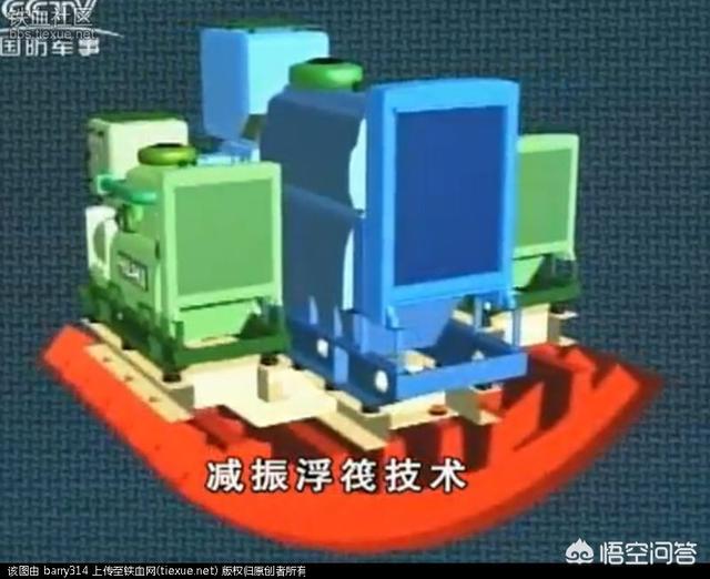 浮筏减震技术就是把潜艇内的机械设备固定在较软的弹性橡胶材料上,然后再固定在艇内,可以大幅度减少和吸收潜艇机械设备的振动,从而达到降低潜艇噪声的目的。