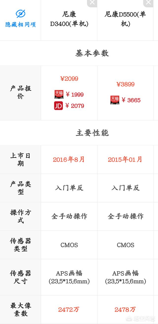 应该说,两款相机差别不大,都是半画幅入门机,但从价位上来看D5500高于D3400,就像素而言两者并没有太大差别。但在外部配置,D5500显示屏可以反转,这一点在仰拍、俯拍等明显优于D3400。最关键一点就是D5500的39点对焦,完胜D3400的11点对焦。这可能就是D5500价格高出1000多的原因。