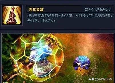 强化要塞--防御塔会进入短暂的无敌状态,并且提高百分之百的攻击速度,此效果会持续7秒,冷却时间为300秒;当这个技能未使用时,召唤师对小兵造成9点额外伤害。