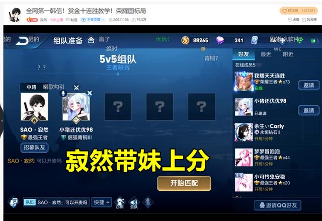 前言:作为王者荣耀国服第一韩信,虎牙平台的寂然在韩信玩家心目中的地位是非常高的,在巅峰赛上都能一人CARRY全场,这样的实力又有几人能够比肩?虽然实力超群,但是寂然却有一个广为诟病的缺点,那就是太直男了,在女生面前害羞得不行,这也一直让粉丝们为他的终身大事而担忧。不过时时操心的粉丝可能要长舒一口气了,因为寂然这家伙竟然开窍了,在游戏大厅找了一个女玩家,带着她打了很久的游戏,这真的是破天荒的一次。看过寂然最近直播的人也都知道这个女玩家,是主玩辅助的,声音好听,而且很会聊天,能跟寂然这种直男聊下去却不冷场,你就知道她有多么厉害了。