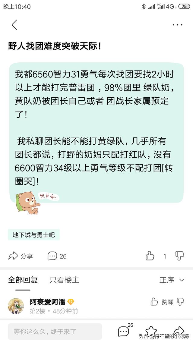 这说法有点匪夷所思,我的小奶妈只有6200多智力,32级勇气基本上是申请团就进去的,哪里需要等上俩小时之久?当然,我都是放到最后两三天才打!