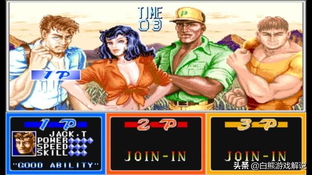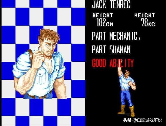 你好《恐龙快打》,这部由卡普空公司出版的经典街机游戏是广大游戏厅必不可少的游戏,也是许多8090后的童年回忆,小时候在游戏厅人气最高的角色一定是黄帽穆斯塔法,甚至有人直接把游戏叫做黄帽,把黄帽当做主角,其实在原著里白人杰克才是主角,黄帽只是他的一个助手,但是在游戏里,杰克似乎有点冷门,甚至被冠以最弱角色的称号,事实果真如此吗,解析一下杰克的实力。首先分析一下为什么好多人认为杰克最弱,一个重要原因就是杰克并没有很突出的特点,杰克是游戏中最平衡的一个,但这也同样意味了杰克没有明显的优势。相比于黄帽的前前踢,胖子的高攻击力,女人的血杀后无敌时间最长,杰克似乎并没有任何优点,黄帽之所以热门是因为前前踢简单有效,适合上手,胖子的高攻击力成为了现今恐龙大神们的热爱,所以说从这个角度来说,杰克确实悲催,杰克是被低估的角色,是个很有潜能可挖掘的角色,下面我们来看看杰克的优点是什么。第一,杰克的下上拳是四人之中最厉害的,女人和胖子这招基本上是废的,黄帽伤害不如杰克,杰克最厉害的连招就是摆拳+前扔接下上拳,而且杰克是仅次于麦斯拥有第二强的攻击力,在最高暴击的情况下一套连招可以打掉一管血。第二,杰克压制起身非常容易控制位置和距离,虽然杰克的拳头最短,但是往前(或往后)跳一下就可以轻轻松松的压制敌人的起身,对于新手和移动不太好的玩家来说,使用杰克压起身是最容易的。第三,也是最主要的一点,就是杰克的前前踢伤害非常高,而且很不容易被攻击到。虽然黄帽的前前踢是最具有招牌性,也是广大新手玩家的最爱,杰克的前前拳并不比黄帽弱多少,而且在有的时候甚至比黄帽的厉害,当然了,杰克的前前踢移动距离比较短,需要控制好时机距离。