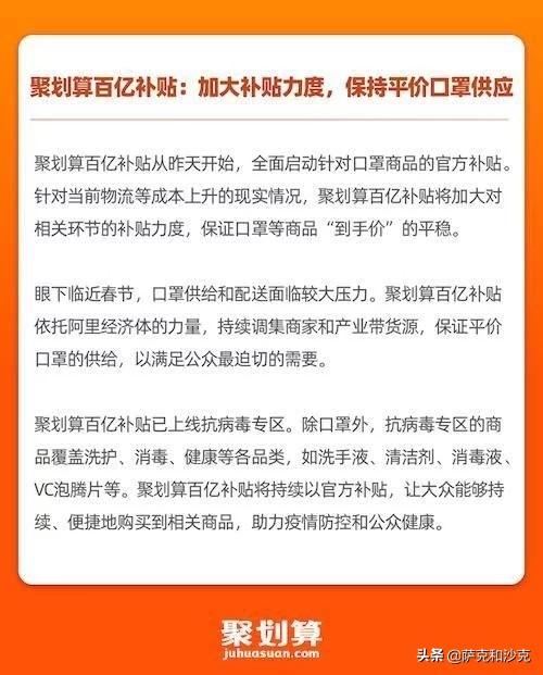 1月21日,淘宝官方发布公告,表示已向淘宝天猫平台上所有销售口罩的商家发出通知,绝不允许涨价销售。目前淘宝天猫平台货源充足,官方启动补贴计划,保证消费者买到价格实惠的正品口罩。据了解,淘宝平台上很多口罩商家开启了加班模式,有供货厂家用5倍工资紧急请已经回老家的一线员工返回岗位,赶制口罩,很多快递小哥也回到了工作岗位,将在春节期间继续给消费者送货。