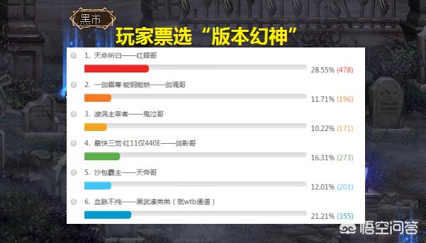 “血脉不纯”的黑武弟弟,得票数355,得票数21.21%,仅次于红眼。虽然俺没怎么玩过黑武,但黑武就是“传说中的幻神”,每次说到黑武都很厉害,但实际上,真正以黑武为大号的玩家却是非常少的。