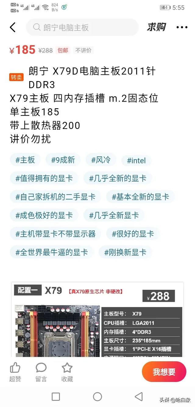 ✔主板选择山寨x79,一说寨板大家可能又要说不稳定啥的,本人组装过10+台x79电脑,并没有任何主板问题,有讨论寨板x79稳定性的也麻烦使用过再评论,二手价格185元。