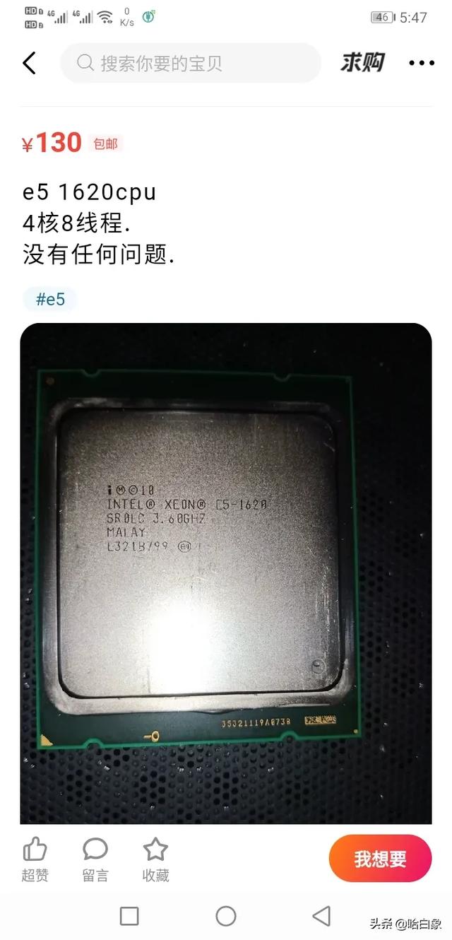 ✔处理器我们选择e5 1620看到e5有人可能会说是洋垃圾不适合打游戏!但是这里我要给他正名,简单介绍下这个处理器参数:四核八线程 主频3.6g不锁倍频,在任何山寨x79主板上可以超频至4.2g,打游戏性能没的说,二手价格130元。