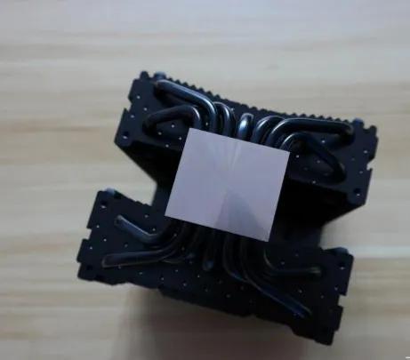 纯铜底座,表面进行了镜面处理,位于内存条位置的是一个120mm风扇。