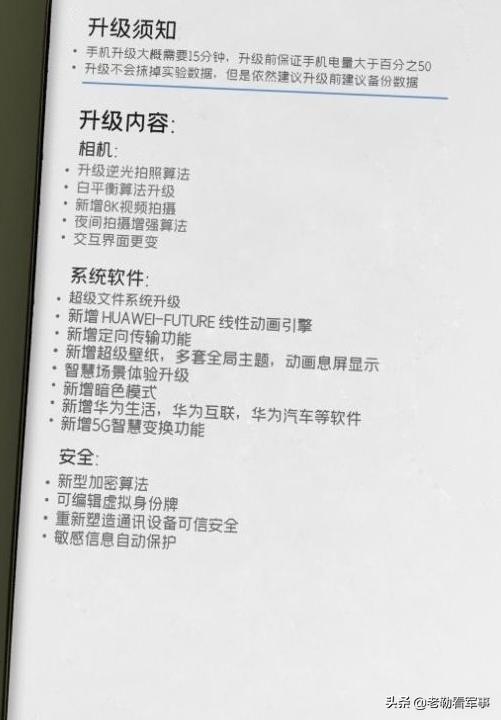 首先告诉大家一个非常现实的东西就是像华为鸿蒙系统这样的系统他首先的目的是要能在华为系比较旧的机型上能运行,因为鸿蒙的目的就是为了取代安卓,他首先的目的是要在华为系的老机型上能够运行,而不是在所谓的新机上原先。而更加现实的就是可以看到在升级内容上竟然全是所谓的拍照升级,而且好像是为了宣传什么似的竟然在里面还能看到新增暗色模式和什么所谓的新增了华为生活,华为互联以及华为汽车等软件。我不知道这是一个多么不了解华为手机的人才能p出这样一张图。因为这些东西都是在华为EMUI10里面早就有的,本身这些华为系统软件就是华为自己做的,要是这个华为都只能在10.1版本里添加,那是不是华为软件中国第一的名头太假了呢?