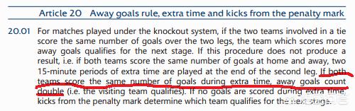 翻开欧足联欧冠规则条款第20.01,写得清楚明白:如果淘汰赛中双方都在加时赛中打入相同数量的进球,客场进球算两个。