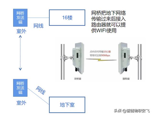 首先,要把地下室的网络通过网线布线到1楼室外的网桥形成发射端,16楼的接收网桥也要布线到室外,两个网桥之间要保证可视无大障碍物,两个网桥就相当于一条无形的网线从地下拉到16楼了。然后,可以在16楼的接收网桥接入路由器,设置好WIFI就可以上网了。