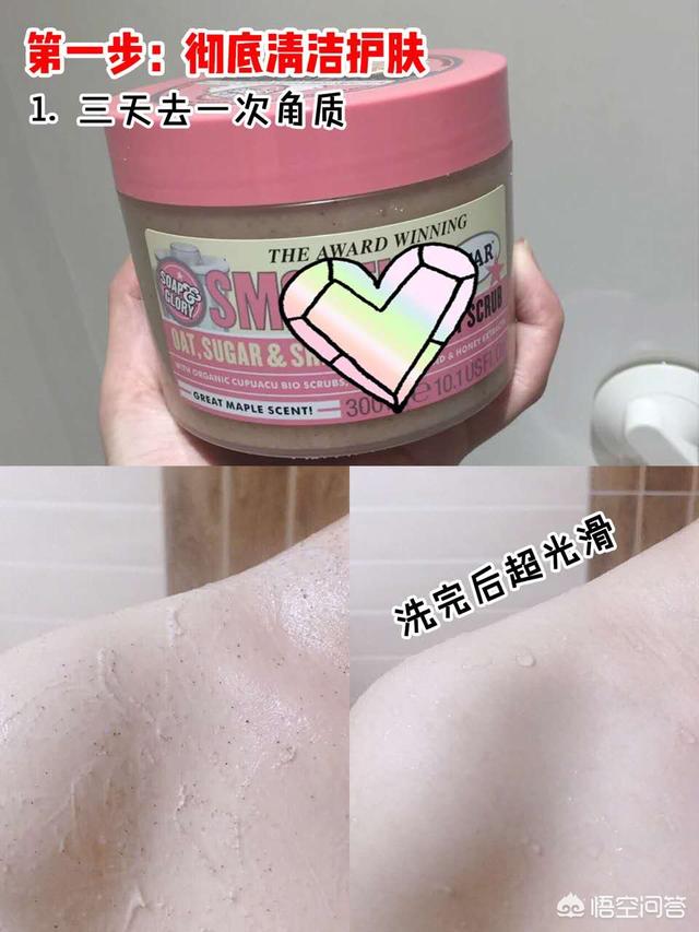 1:三天一次去角质。磨砂膏一定要选好,如果有“卡波”成分最好别用,因为它会橡皮擦一样的不断的擦出假角质,最后你以为去干净了,其实并没有。去完角质后皮肤由内而外的闪闪发光,吸收力也是牛掰!涂完身体乳一整天都是软软的。超级Q。