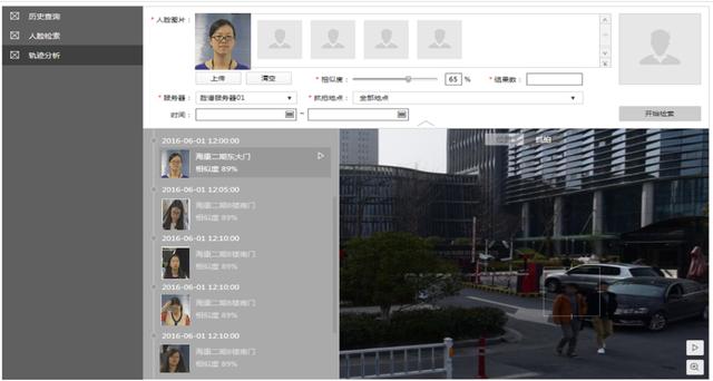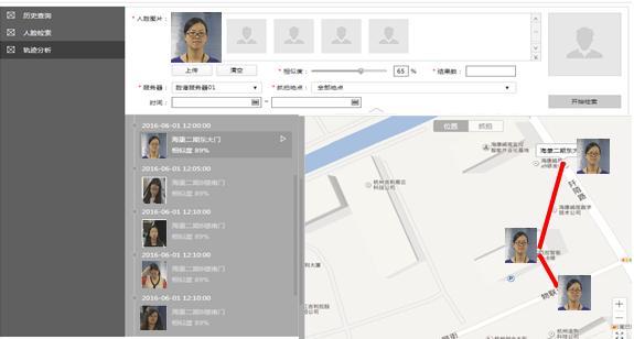 系统支持通过以脸搜脸功能,将符合阈值的人脸图片搜索并以列表形式展示,同时按照时间顺序依次在地图上展示出人员的轨迹,便于用户从整体上把握目标人员的全部活动轨迹,有利于事后分析和取证。