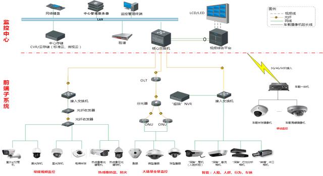 监控中心采用视频综合平台完成视频的解码、拼接,上墙等应用。通过部署LCD、LED大屏用来将视频进行上墙显示。
