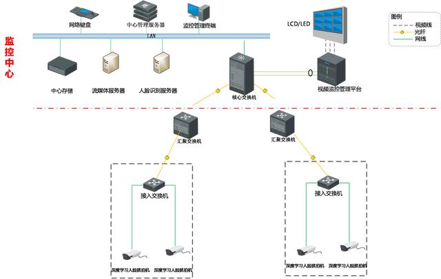 从应用上分,视频监控系统的包含常规视频监控和智能人脸识别两个主要部分。