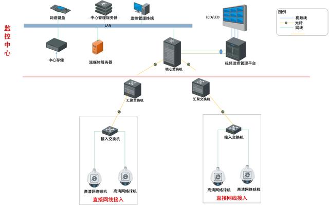 前端与接入交换机之间可通过有线网络或无线网络接入。有线网络中主要包括3种方式连接:光纤收发器的点对点光纤接入方式,直接接入交换机方式(距离100米以内),点对多点光纤PON接入方式,均可将前端信号汇聚至中心的核心交换机。