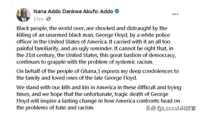 现在美国境内针对黑人的歧视,包括有色人种的歧视是系统性问题(下图为加纳总统对美国系统性歧视黑人问题谴责),是整个美国体制多年累积下来的结果,作为一个总统在自己的任上几乎没有改变的能力。