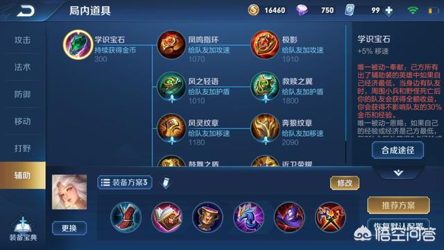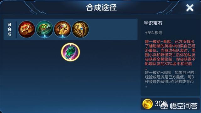 价值300金币的学识宝石,虽然看似作用不大。但是实则作用非常大,它能够使得经济的合理分配,把有用的经济分配给有用的队友身上,同时还是最便宜的移速加持装备。不要小瞧这件装备,它对一个团队的作用是非常大的,对于一个英雄的作用也非常大,因为它加持移速。