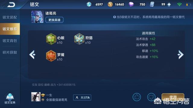铭文,10狩猎,10心眼,10梦魇属性总和:法术攻击+42,法术穿透+88,移速+10%,攻击速度+16%分析:这里很多人会说法师带攻速干嘛,蓝色带狩猎其实就是取他的10%的移速,支援速度快,手感方面好,走位,逃跑能力强,缺点是没续航能力。