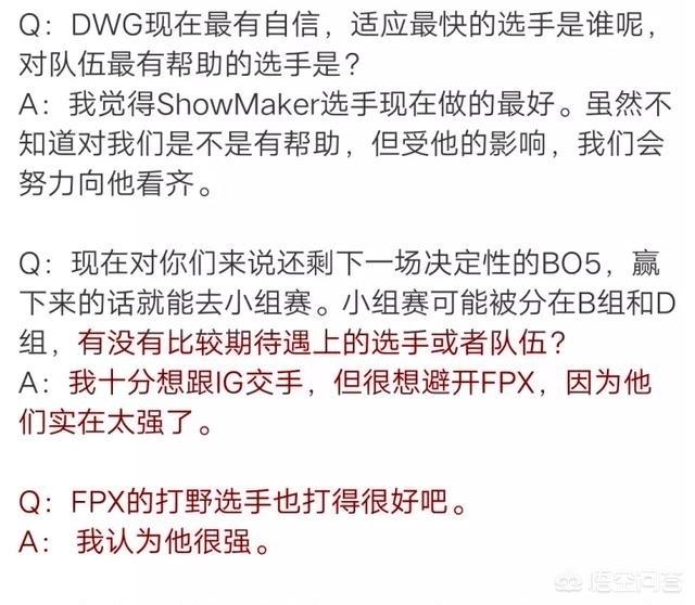 赛后,DWS在接受媒体采访的时候说“我们十分想和IG交手,但很想避开FPX,因为他们实在太强了” 言下之意就是,很怕LPL的新王FPX,宁愿去和卫冕冠军IG打,也不愿意和FPX打。