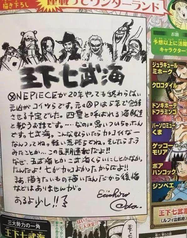尾田最初的设定是用五年的时间来完结《海贼王》:一年筹集伙伴,三年冒险,最终章一年。但是在发售《海贼王》二十周年纪念总集篇里,尾田就留言到:本来让主角最后跟四皇决斗,但是中间却萌发出了七武海这个点子,本来无心之举,没想到却要变成了长期连载的样子。