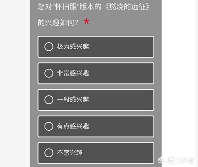 相信昨天很多玩家都收到了一份暴雪调查问卷,而在这份调查问卷便中有一则关于TBC版本怀旧服的问题,询问玩家对怀旧服版本《燃烧的远征》是否有兴趣,虽然选项非常多,但是从选项来看,暴雪还是倾向于开放TBC版本的,可见NAXX阶段开放之后,用不了多久,暴雪就会开启TBC版本怀旧服的测试。