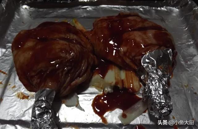 6.将腌制好的鸭腿入烤箱烤制250度10分钟,200度20分钟(时间要根据自家烤箱而定,亲们要注意~~),在鸭腿最细的部位最好包上锡纸以免过火。取出烤好的鸭腿放凉备用。