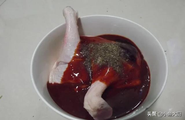 3.大喜大香辣烤肉酱倒入鸭腿上加上黑胡椒碎、蚝油。