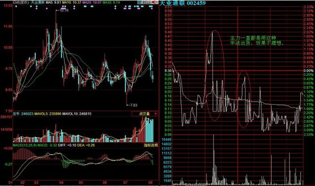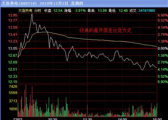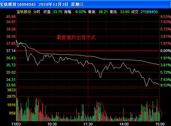 三、广普出货方式。 这是主力应用最广的出货方式。开盘后分时线始终受均价线压制,反弹不过均价线,下跌放量,反弹无量,是典型的弱势出货走势。