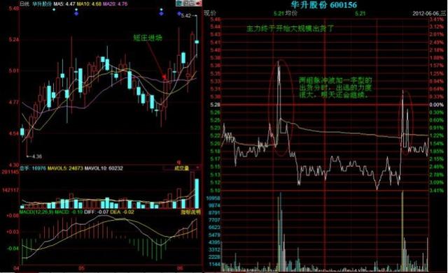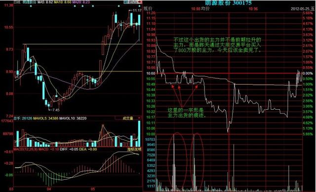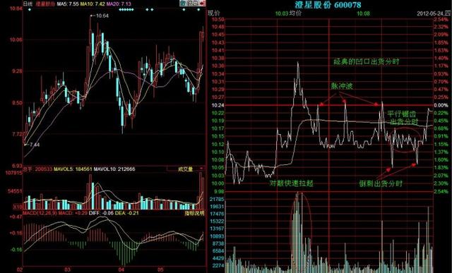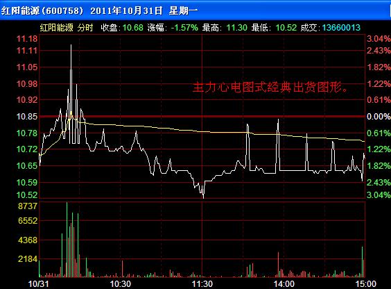一、对敲式心电图出货。 这是最常见的出货方式。盘口表现为主力在买1--5挂满大单,同时在卖1--5挂出一张巨大的卖单,主力不断使用大买单对准卖一啃去,引诱散户跟风,大卖单啃完后,主力迅速拉起,散户以为股票要启动,纷纷跟进,结果主力又一笔巨大卖单将股价砸回原地。主力不断地用这种手法对敲出货,后市将大跌。