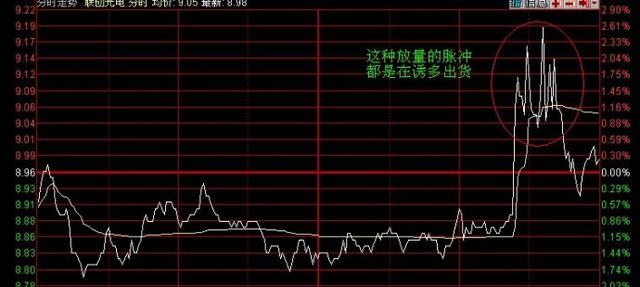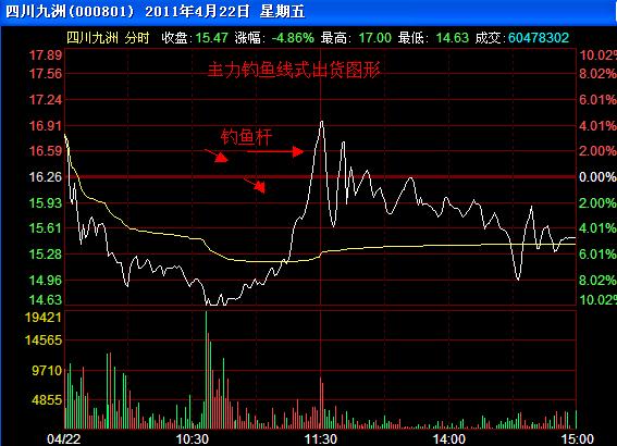 二、钓鱼式出货(假升波出货)。一般出现在股价大幅上涨的末期,盘中表现为主力迅速拉高股价,中间没有任何停顿,分时走势陡峭,涨幅超过7%,然后主力大单抛货将下方追涨的买盘一网打尽。盘中往往还会出现跳水走势。第2天一般是低开低走套住所有追涨的人。