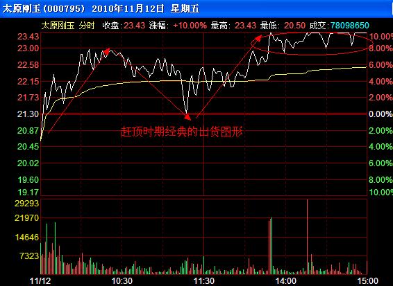 五、赶顶式出货。 股票大幅上涨后上攻明显不流畅,股价震荡明显加剧,这是主力反复出货的标志。更主要的是封停后反复开板且放出巨量。