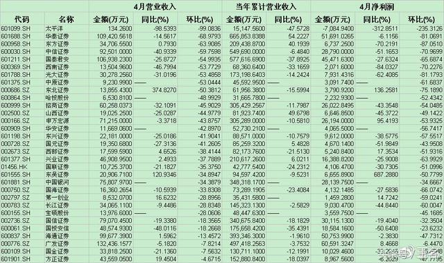 最新的月报显示,4月份,28家上市券商合计净利润环比下降53.54%,同比下降25.96%。除国金证券环比净利润出现6%的增长外,上市券商净利润环比普遍下降。广发证券4月份净利润环比下降6%至6.06亿元,跃升为上市券商净利润排名第1位,业绩稳健未出现剧烈波动。兴业证券母公司4月份净利1.42亿元,环比下降68%;西部证券母公司4月净利5241万元,环比下降52%;国元证券母公司4月份营收1.94亿元,净利为4670万元,环比下降44%;第一创业母公司4月份净利为2218万元,环比下降50%;华安证券母公司4月份净利4066万元,环比下降57%。