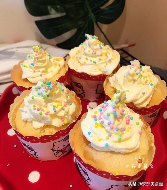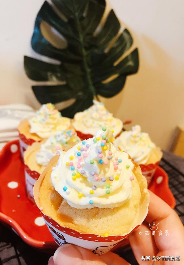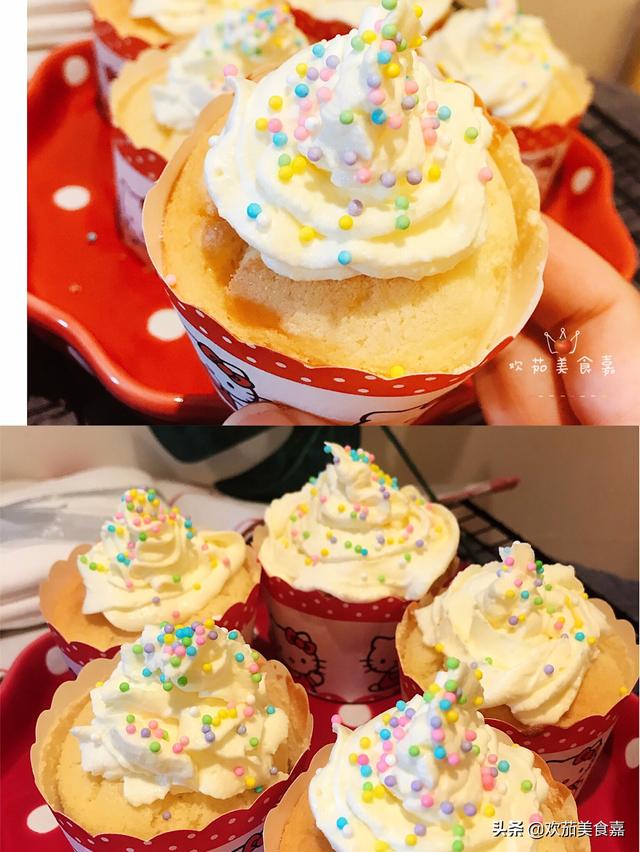 14、打发好的奶油装入裱花袋,挤到马芬蛋糕上就完成了,上面还可以装饰上自己喜欢的糖豆或小饼干哦!