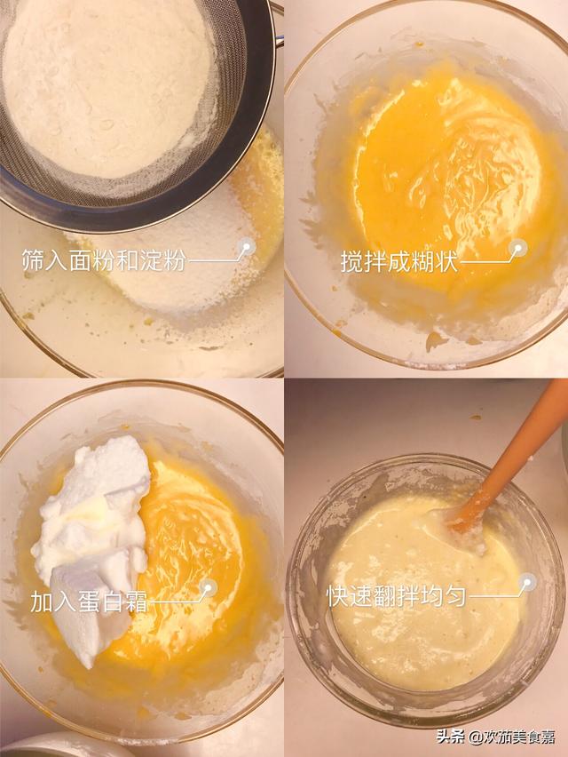 9、取出冷藏的蛋白霜,和面糊混合。先用刮铲铲出三分之一的蛋白霜放入面糊中,快速翻拌。翻拌的手法是刮铲从2点方向划向8点方向,翻动刮铲,另一只手配合转动一下碗。这种翻拌手法可以减少蛋白霜消泡。两者混合好后,将混合好的面糊倒入剩余的蛋白霜中,继续快速翻拌,让全部蛋糕糊混合均匀。